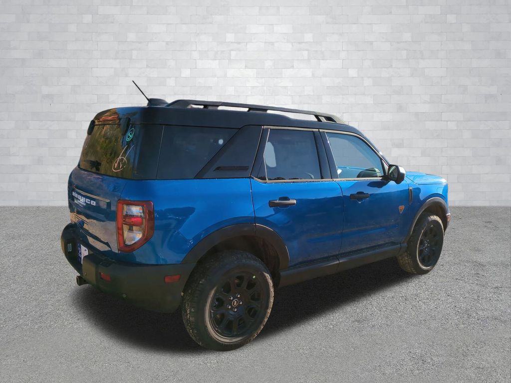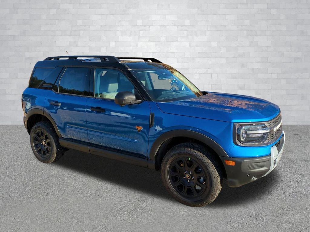 2025 Velocity Blue Metallic 2025 Ford Bronco Sport Badlands 4WD EcoBoost 2.0L I4 GTDi DOHC Turbocharged VCT Equipment Group 400A, 4-Wheel Disc Brakes, 6 Speakers, ABS brakes, Air Conditioning, Alloy wheels, AM/FM radio: SiriusXM, AM/FM Stereo, Auto High-beam Headlights, Auto-dimming Rear-View mirror, Automatic temperature control, Brake assist, Compass, Delay-off headlights, Driver door bin, Driver vanity mirror, Dual front impact airbags, Dual front side impact airbags, Electronic Stability Control, Emergency communication system: SYNC 4 911 Assist, Four wheel independent suspension, Front anti-roll bar, Front Bucket Seats, Front Center Armrest, Front fog lights, Front License Plate Bracket, Front reading lights, Fully automatic headlights, Garage door transmitter, Heated door mirrors, Heated front seats, Heated steering wheel, Illuminated entry, Knee airbag, Leather Trimmed Front Bucket Seats, Low tire pressure warning, Memory seat, Occupant sensing airbag, Outside temperature display, Overhead airbag, Overhead console, Panic alarm, Passenger door bin, Passenger vanity mirror, Power door mirrors, Power driver seat, Power passenger seat, Power steering, Power windows, Radio data system, Rear anti-roll bar, Rear reading lights, Rear seat center armrest, Rear window defroster, Rear window wiper, Remote keyless entry, Security system, SiriusXM, Speed control, Speed-sensing steering, Speed-Sensitive Wipers, Split folding rear seat, Steering wheel mounted audio controls, SYNC 4 w/Enhanced Voice Recognition, Tachometer, Telescoping steering wheel, Tilt steering wheel, Traction control, Trip computer, Variably intermittent wipers, and Wheels: 17" Matte Black-Painted Aluminum Courtesy Ford and Lincoln of Rome 101 Hwy 411 E Rome, Ga 30161 ROMEFORDLINC.COM 706.235.4453.