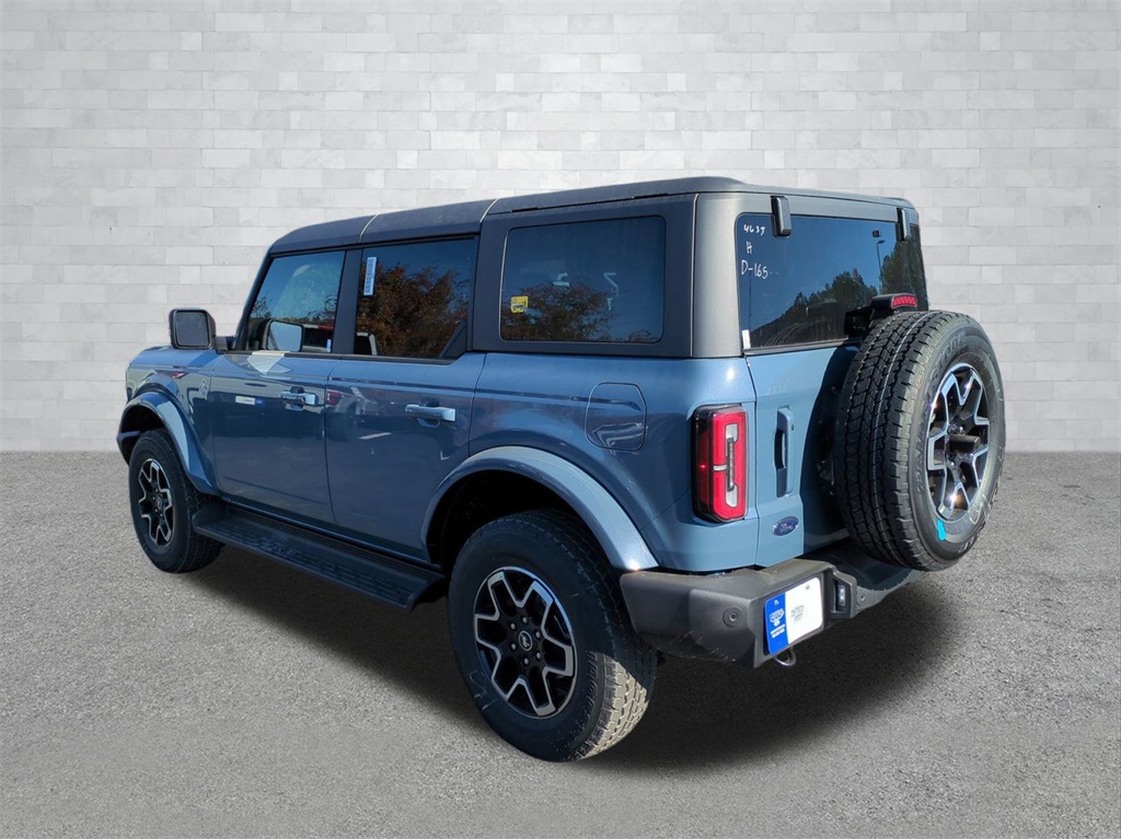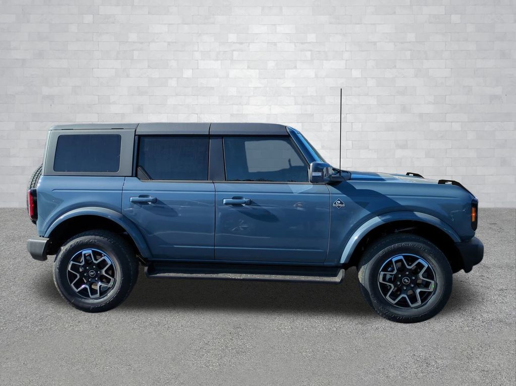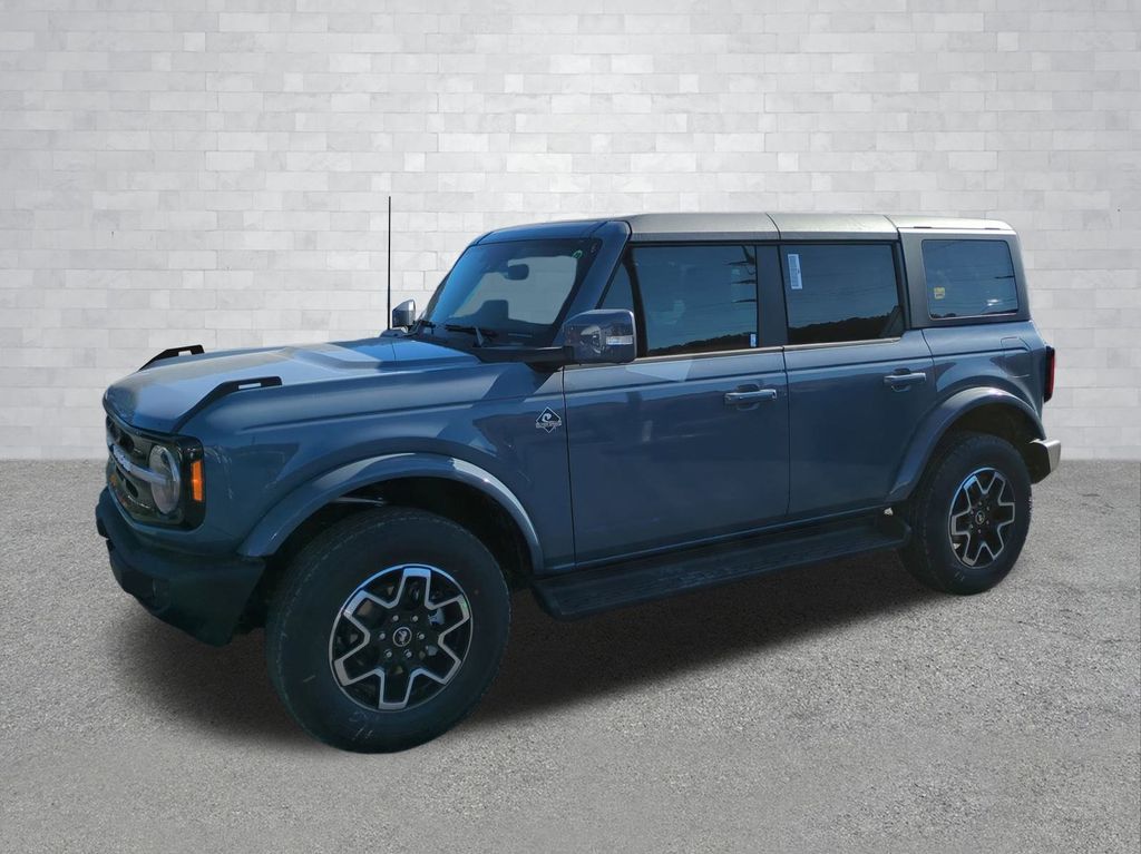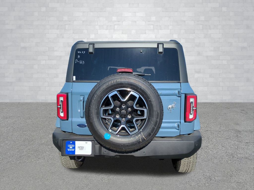 2025 Azure Gray Metallic Tri-Coat 2025 Ford Bronco Outer Banks 4WD 2.3L EcoBoost I-4 Equipment Group 314A Lux Package (360-Degree Camera, Adaptive Cruise Control, Evasive Steering Assist, Front Parking Sensors, Information on Demand Panel, Radio: B&O Sound System by Bang & Olufsen, Sideview Mirrors, and Universal Garage Door Opener), 18" Bright Machined Aluminum Wheels, 3.73 Axle Ratio, 4-Wheel Disc Brakes, 7 Speakers, ABS brakes, Air Conditioning, Alloy wheels, AM/FM radio: SiriusXM with 360L, AM/FM Stereo, Auto High-beam Headlights, Auto-dimming Rear-View mirror, Automatic temperature control, Brake assist, Carbonized Gray Molded-In-Color Hard Top, Compass, Connected Navigation, Delay-off headlights, Driver door bin, Driver vanity mirror, Dual front impact airbags, Dual front side impact airbags, Electronic Stability Control, Emergency communication system: 911 Assist, Exterior Parking Camera Rear, Front anti-roll bar, Front Bucket Seats, Front Center Armrest, Front dual zone A/C, Front fog lights, Front reading lights, Front wheel independent suspension, Fully automatic headlights, Hard Top Sound Deadening Headliner, Heated door mirrors, Heated front seats, Heated Leather-Trimmed/Vinyl Bucket Seats, Heated steering wheel, Illuminated entry, Integrated roll-over protection, Internet access capable: FordPass Connect, Leather Shift Knob, Low tire pressure warning, Navigation system: Connected Navigation, Occupant sensing airbag, Outside temperature display, Overhead airbag, Overhead console, Panic alarm, Passenger door bin, Passenger vanity mirror, Power door mirrors, Power driver seat, Power passenger seat, Power steering, Power windows, Radio data system, Rear seat center armrest, Rear-Window Defroster & Washer, Remote keyless entry, Security system, SiriusXM w/360L, Speed control, Split folding rear seat, Steering wheel mounted audio controls, SYNC 4, Tachometer, Telescoping steering wheel, Tilt steering wheel, Traction control, Trip computer, Variably intermittent wipers, and Voltmeter Courtesy Ford and Lincoln of Rome 101 Hwy 411 E Rome, Ga 30161 ROMEFORDLINC.COM 706.235.4453.