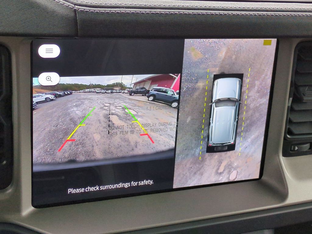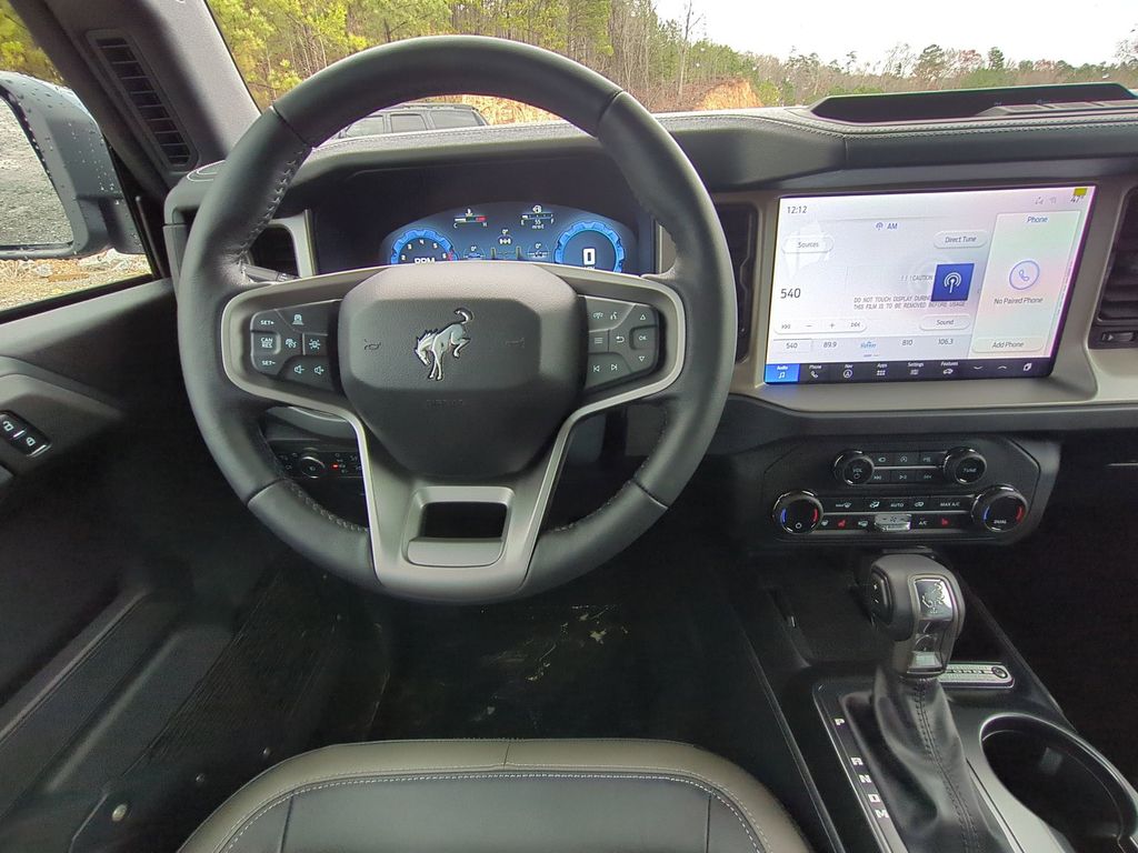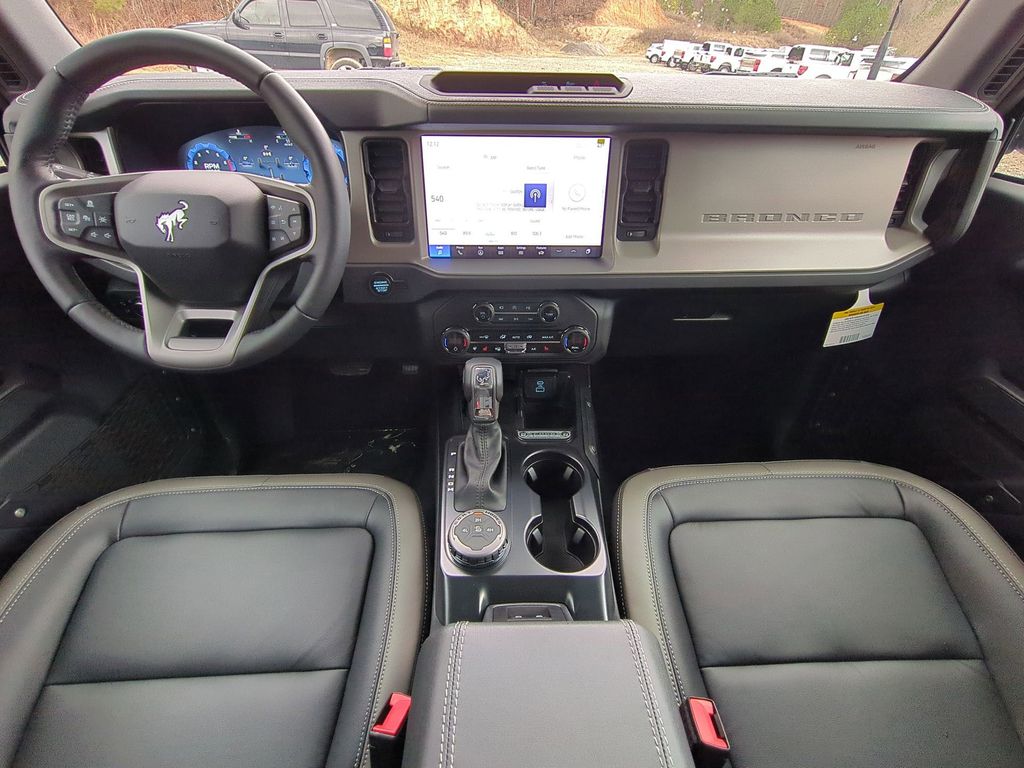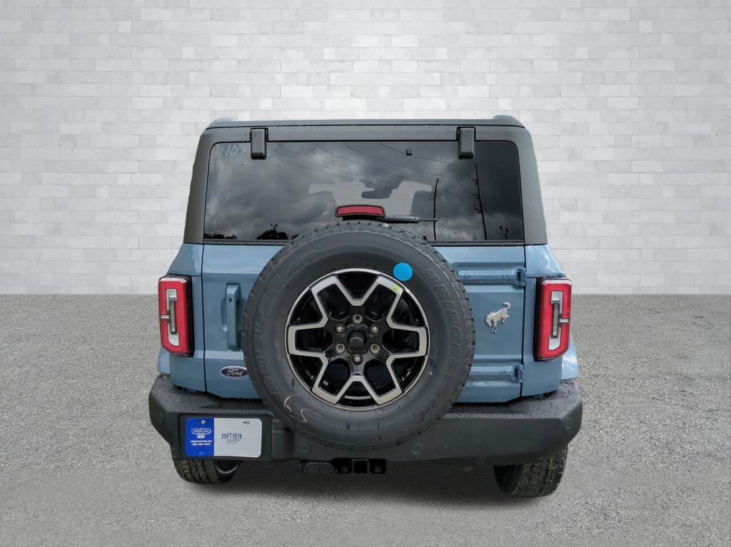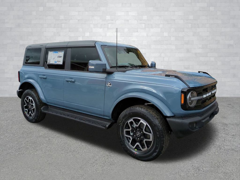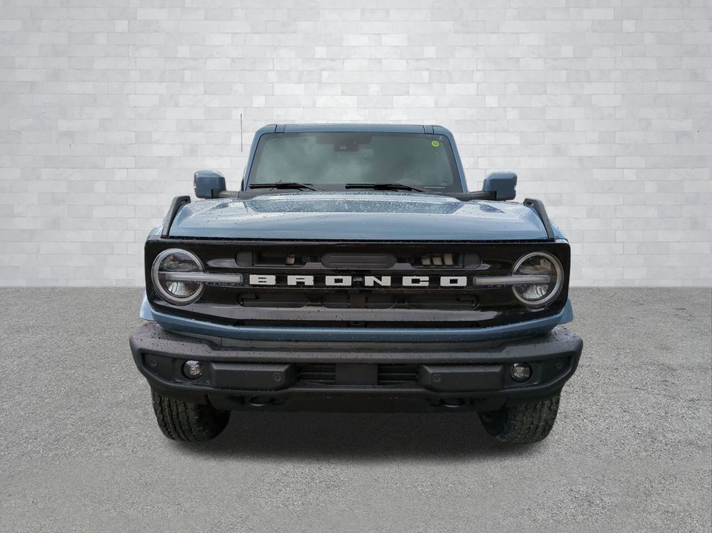 2025 Azure Gray Metallic Tri-Coat 2025 Ford Bronco Outer Banks 4WD 2.3L EcoBoost I-4 Equipment Group 314A Lux Package (360-Degree Camera, Adaptive Cruise Control, Evasive Steering Assist, Front Parking Sensors, Information on Demand Panel, Radio: B&O Sound System by Bang & Olufsen, Sideview Mirrors, and Universal Garage Door Opener), 18" Bright Machined Aluminum Wheels, 3.73 Axle Ratio, 4-Wheel Disc Brakes, 7 Speakers, ABS brakes, Air Conditioning, Alloy wheels, AM/FM radio: SiriusXM with 360L, AM/FM Stereo, Auto High-beam Headlights, Auto-dimming Rear-View mirror, Automatic temperature control, Brake assist, Carbonized Gray Molded-In-Color Hard Top, Compass, Connected Navigation, Delay-off headlights, Driver door bin, Driver vanity mirror, Dual front impact airbags, Dual front side impact airbags, Electronic Stability Control, Emergency communication system: 911 Assist, Exterior Parking Camera Rear, Front anti-roll bar, Front Bucket Seats, Front Center Armrest, Front dual zone A/C, Front fog lights, Front reading lights, Front wheel independent suspension, Fully automatic headlights, Hard Top Sound Deadening Headliner, Heated door mirrors, Heated front seats, Heated Leather-Trimmed/Vinyl Bucket Seats, Heated steering wheel, Illuminated entry, Integrated roll-over protection, Internet access capable: FordPass Connect, Leather Shift Knob, Low tire pressure warning, Navigation system: Connected Navigation, Occupant sensing airbag, Outside temperature display, Overhead airbag, Overhead console, Panic alarm, Passenger door bin, Passenger vanity mirror, Power door mirrors, Power driver seat, Power passenger seat, Power steering, Power windows, Radio data system, Rear seat center armrest, Rear-Window Defroster & Washer, Remote keyless entry, Security system, SiriusXM w/360L, Speed control, Split folding rear seat, Steering wheel mounted audio controls, SYNC 4, Tachometer, Telescoping steering wheel, Tilt steering wheel, Traction control, Trip computer, Variably intermittent wipers, and Voltmeter Courtesy Ford and Lincoln of Rome 101 Hwy 411 E Rome, Ga 30161 ROMEFORDLINC.COM 706.235.4453.