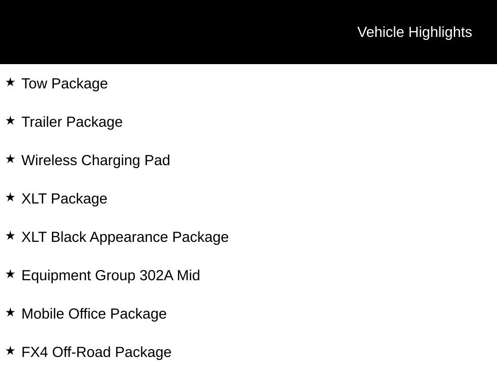 2025 Oxford White 2025 Ford F-150 XLT 4WD 3.5L PowerBoost Full-Hybrid V6 12" LCD Productivity Touchscreen, 5G WiFi Hotspot Telematics, Auto Emergency Braking, Auto LED Headlights, Backup Camera, Blind Spot Monitoring, BLIS w/ Cross Traffic Alert, Bluetooth w/ Audio Streaming, Lane Keeping System, Off Road Package, Parking Sensors, Power Sliding Rear Window, Pre-Collision w/ Pedestrian Detection, Reverse Brake Assist, Reverse Sensing, Skid Plate Package, Tow Package, Trailer Package, Wireless Charging Pad, XLT Package, 4D SuperCrew, 3.5L PowerBoost Full-Hybrid V6, 10-Speed Automatic, 4WD, 360 Degree Camera, 4 Pickup Box Tie-Down Plates, 400W Cab & Bed Outlets, 4x4 FX4 Off-Road Bodyside Decal, 6" Angular Bright Anodized Step Bar, 6" Black Running Boards, Adaptive Cruise Control w/Stop & Go, Auto-Dimming Rear-View Mirror, Bed Utility Package, Black Exterior Badging, Black Grille, Black Painted Grille w/Chrome Center Bar, Body-Color Front & Rear Bumpers, Chrome Door & Tailgate Handles, Chrome Single-Tip Exhaust, Cloth 40/Console/40 Front Seats, Connected Navigation, Console Worksurface, Dark Interior Appliques, Driver State Detection, Dual-Zone Electronic Automatic Temperature Control, Electronic Locking w/3.73 Axle Ratio, Equipment Group 302A Mid, Evasive Steering Assist, Floor Shifter, Ford Co-Pilot360 Assist 2.0, Front Parking Sensors, FX4 Off-Road Package, Gray Box Side Decal, Heated Front Seats, Hill Descent Control, Intelligent Access w/Push Button Start, LED Box Lighting, Mobile Office Package, Monotube Rear Shocks, Off-Road Tuned Front Shock Absorbers, Partitioned Lockable Rear Storage, Power Glass Heated Sideview Mirrors, Power-Sliding Rear Window, Remote Start System w/Remote Tailgate Release, Rock Crawl Mode, Tailgate Step w/Tailgate Work Surface, Towing Technology, Tray Style Floor Liner w/o Carpet Mats, Unique Sport Cloth 40/Console/40 Front-Seats, Wheels: 18" Gloss Black, Wrapped Steering Wheel, XLT Black Appearance Package. Bed Utility Package (4 Pickup Box Tie-Down Plates, LED Box Lighting, and Tailgate Step w/Tailgate Work Surface), Equipment Group 302A Mid (360 Degree Camera, 400W Cab & Bed Outlets, 6" Angular Bright Anodized Step Bar, Adaptive Cruise Control w/Stop & Go, Auto-Dimming Rear-View Mirror, Black Painted Grille w/Chrome Center Bar, Chrome Door & Tailgate Handles, Chrome Single-Tip Exhaust, Cloth 40/Console/40 Front Seats, Connected Navigation, Driver State Detection, Dual-Zone Electronic Automatic Temperature Control, Evasive Steering Assist, Ford Co-Pilot360 Assist 2.0, Front Parking Sensors, Heated Front Seats, Intelligent Access w/Push Button Start, Power Glass Heated Sideview Mirrors, Power-Sliding Rear Window, Remote Start System w/Remote Tailgate Release, Towing Technology, and Wrapped Steering Wheel), FX4 Off-Road Package (4x4 FX4 Off-Road Bodyside Decal, Hill Descent Control, Monotube Rear Shocks, Off-Road Tuned Front Shock Absorbers, Rock Crawl Mode, and Tray Style Floor Liner w/o Carpet Mats), Mobile Office Package (Console Worksurface and Partitioned Lockable Rear Storage), XLT Black Appearance Package (6" Black Running Boards, Black Exterior Badging, Black Grille, Body-Color Front & Rear Bumpers, Dark Interior Appliques, Floor Shifter, Gray Box Side Decal, Unique Sport Cloth 40/Console/40 Front-Seats, and Wheels: 18" Gloss Black), 4D SuperCrew, 3.5L PowerBoost Full-Hybrid V6, 10-Speed Automatic, 4WD, Electronic Locking w/3.73 Axle Ratio, 4-Wheel Disc Brakes, 6 Speakers, ABS brakes, Air Conditioning, Alloy wheels, Auto High-beam Headlights, Brake assist, Bumpers: chrome, Chrome wheels, Cloth 40/20/40 Front Seat, Compass, Delay-off headlights, Driver door bin, Driver vanity mirror, Dual front impact airbags, Dual front side impact airbags, Electronic Stability Control, Emergency communication system: SYNC 4 911 Assist, Front anti-roll bar, Front Center Armrest, Front fog Price includes dealer added acce