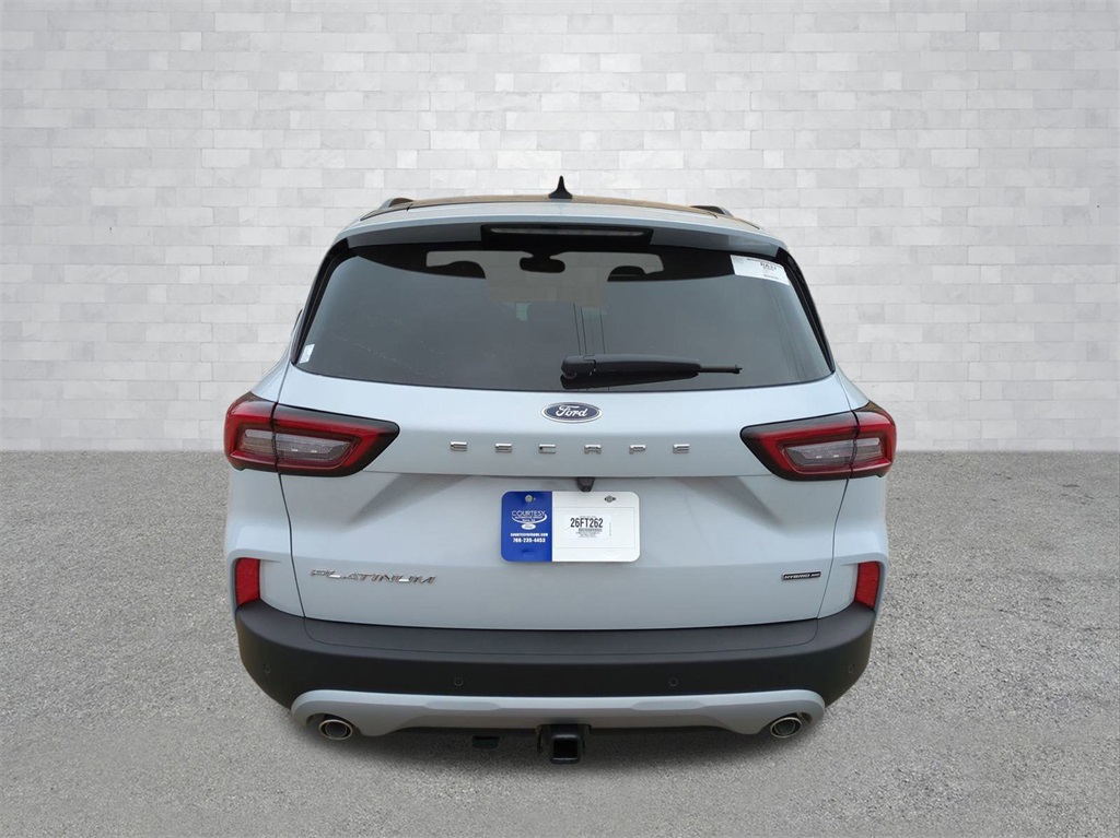 2026 Space Silver Metallic 2026 Ford Escape Hybrid Platinum AWD 2.5L iVCT 2.5L iVCT. Class II Trailer Tow Package, Equipment Group 600A (10-Way Power Driver's Seat w/Memory, 2.91 Axle Ratio, 6-Way Power Front Passenger Seat, ActiveX Trimmed Heated Front Sport Contour Bucket Seats with Mini-Perforations, Connected Navigation (1-Year Included), Electronic Fuel Door Release, Ford App, Neutral Towing Capability, Pedestrian Alert Sounder, Radio: AM/FM Stereo with SiriusXM 360L, SYNC 4 with Enhanced Voice Recognition, and Wheels: 19" Machined-Face Ebony-Painted Aluminum), Premium Technology Package (360-Degree Camera with Split View, ActiveX Trimmed Heated Front Sport Contour Bucket Seats with Quilting Design, B&O Sound System by Bang & Olufsen, Front Parking Sensors, HD Radio, Head-Up Display, and Reverse Brake Assist), 2.5L iVCT, 4-Wheel Disc Brakes, 6 Speakers, ABS brakes, Air Conditioning, Alloy wheels, AM/FM radio: SiriusXM 360L, Auto High-beam Headlights, Auto-dimming Rear-View mirror, Automatic temperature control, Black Roof-Rack Side Rails, Brake assist, Bumpers: body-color, Compass, Delay-off headlights, Driver door bin, Driver vanity mirror, Dual front impact airbags, Dual front side impact airbags, Electronic Stability Control, Emergency communication system: SYNC 4 911 Assist, Four wheel independent suspension, Front anti-roll bar, Front Bucket Seats, Front Center Armrest, Front dual zone A/C, Front fog lights, Front reading lights, Fully automatic headlights, Heated door mirrors, Heated front seats, Heated steering wheel, Illuminated entry, Knee airbag, Low tire pressure warning, Memory seat, Navigation system: Connected Navigation, Occupant sensing airbag, Outside temperature display, Overhead airbag, Overhead console, Panic alarm, Panoramic Vista Roof, Passenger door bin, Passenger vanity mirror, Power door mirrors, Power driver seat, Power Liftgate, Power passenger seat, Power steering, Power windows, Radio data system, Rear anti-roll bar, Rear Parking Sensors, Rear reading lights, Rear seat center armrest, Rear window defroster, Rear window wiper, Remote keyless entry, Security system, Speed control, Speed-sensing steering, Speed-Sensitive Wipers, Split folding rear seat, Spoiler, Steering wheel mounted audio controls, Tachometer, Telescoping steering wheel, Tilt steering wheel, Traction control, Trip computer, and Variably intermittent wipers Courtesy Ford and Lincoln of Rome 101 Hwy 411 E Rome, Ga 30161 ROMEFORDLINC.COM 706.235.4453.