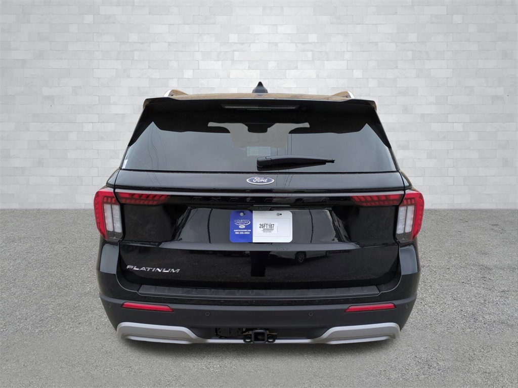 2026 Agate Black Metallic 2026 Ford Explorer Platinum RWD 2.3L EcoBoost I-4 14 Speakers, 3rd row seats: bench, 4-Wheel Disc Brakes, ABS brakes, ActiveX Trimmed Captain's Chairs, Air Conditioning, Alloy wheels, AM/FM radio: SiriusXM with 360L, Apple CarPlay/Android Auto, Auto High-beam Headlights, Auto-dimming door mirrors, Auto-dimming Rear-View mirror, Automatic temperature control, Brake assist, Bumpers: body-color, Compass, Delay-off headlights, Driver door bin, Driver vanity mirror, Dual front impact airbags, Dual front side impact airbags, Electronic Stability Control, Emergency communication system: 911 Assist, Exterior Parking Camera Rear, Four wheel independent suspension, Front anti-roll bar, Front Bucket Seats, Front Center Armrest, Front dual zone A/C, Front fog lights, Front reading lights, Fully automatic headlights, Garage door transmitter, Heated door mirrors, Heated front seats, Heated rear seats, Heated steering wheel, Illuminated entry, Knee airbag, Leather steering wheel, Low tire pressure warning, Memory seat, Navigation System, Occupant sensing airbag, Outside temperature display, Overhead airbag, Overhead console, Panic alarm, Passenger door bin, Passenger vanity mirror, Power door mirrors, Power driver seat, Power Liftgate, Power passenger seat, Power steering, Power windows, Radio data system, Radio: B&O Sound System by Bang & Olufsen with HD, Rain sensing wipers, Rear air conditioning, Rear anti-roll bar, Rear reading lights, Rear window defroster, Rear window wiper, Remote keyless entry, Security system, Speed control, Speed-sensing steering, Speed-Sensitive Wipers, Split folding rear seat, Spoiler, Steering wheel mounted audio controls, Tachometer, Telescoping steering wheel, Tilt steering wheel, Traction control, Trip computer, Turn signal indicator mirrors, Variably intermittent wipers, Ventilated front seats, and Wheels: 20" Luster Nickel-Painted Aluminum Courtesy Ford and Lincoln of Rome 101 Hwy 411 E Rome, Ga 30161 ROMEFORDLINC.COM 706.235.4453.