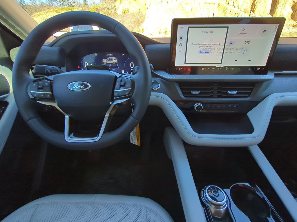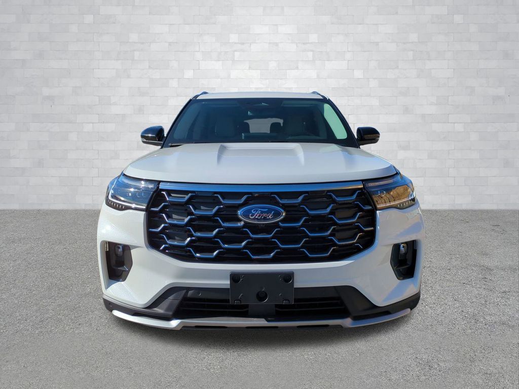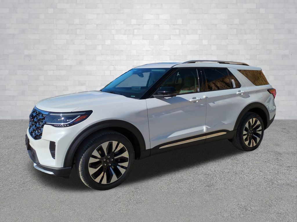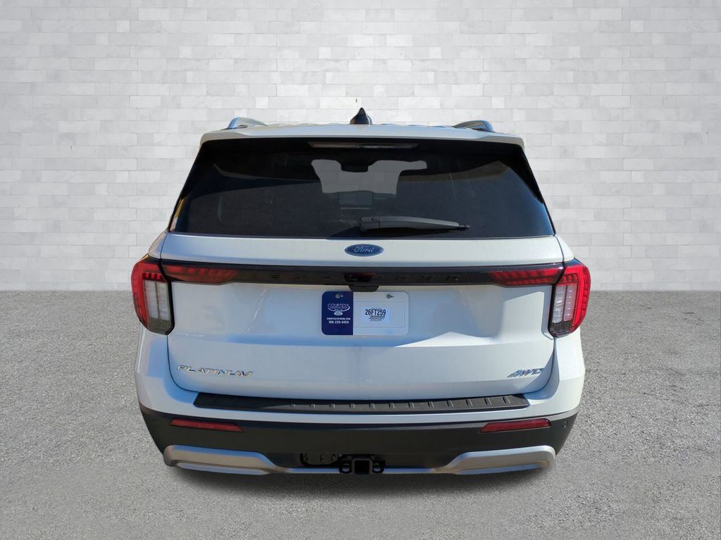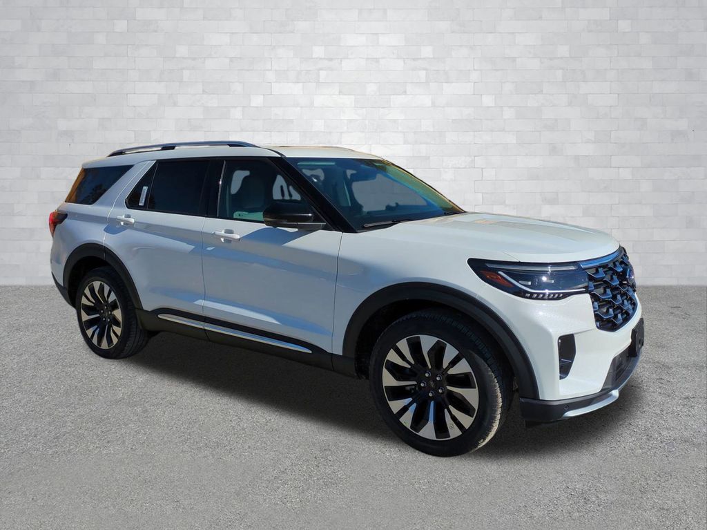 2026 Star White Metallic Tri-Coat 2026 Ford Explorer Platinum 4WD 2.3L EcoBoost I-4 4WD. Equipment Group 600A Standard Package (ActiveX Trimmed Captain's Chairs, Radio: B&O Sound System by Bang & Olufsen with HD, and Wheels: 20" Luster Nickel-Painted Aluminum), Ford Connectivity Package (one-Time Purchase - 7 Years), Lux Leather Package (Platinum Badges on Front Row Seats, Premium Leather Seating Surfaces Captain's Chairs, Quilting and Stitching on Door Panels, and Quilting and Stitching on Seats), 4WD, 14 Speakers, 3rd row seats: bench, 4-Wheel Disc Brakes, ABS brakes, Air Conditioning, Alloy wheels, AM/FM radio: SiriusXM with 360L, Apple CarPlay/Android Auto, Auto High-beam Headlights, Auto-dimming door mirrors, Auto-dimming Rear-View mirror, Automatic temperature control, Brake assist, Bumpers: body-color, Compass, Delay-off headlights, Driver door bin, Driver vanity mirror, Dual front impact airbags, Dual front side impact airbags, Electronic Stability Control, Emergency communication system: 911 Assist, Exterior Parking Camera Rear, Four wheel independent suspension, Front anti-roll bar, Front Bucket Seats, Front Center Armrest, Front dual zone A/C, Front fog lights, Front License Plate Bracket, Front reading lights, Fully automatic headlights, Garage door transmitter, Heated door mirrors, Heated front seats, Heated rear seats, Heated steering wheel, Illuminated entry, Knee airbag, Leather steering wheel, Low tire pressure warning, Memory seat, Navigation System, Occupant sensing airbag, Outside temperature display, Overhead airbag, Overhead console, Panic alarm, Panoramic Fixed Glass Roof with Power Shade, Passenger door bin, Passenger vanity mirror, Power door mirrors, Power driver seat, Power Liftgate, Power passenger seat, Power steering, Power windows, Radio data system, Rain sensing wipers, Rear air conditioning, Rear anti-roll bar, Rear reading lights, Rear window defroster, Rear window wiper, Remote keyless entry, Security system, SiriusXM with 360L (3-Year Plan), Speed control, Speed-sensing steering, Speed-Sensitive Wipers, Split folding rear seat, Spoiler, Steering wheel mounted audio controls, Tachometer, Telescoping steering wheel, Tilt steering wheel, Traction control, Trip computer, Turn signal indicator mirrors, Variably intermittent wipers, Ventilated front seats, and Wheels: : 21" Bright Machined Aluminum w/Tarnish Dark Pockets Courtesy Ford and Lincoln of Rome 101 Hwy 411 E Rome, Ga 30161 ROMEFORDLINC.COM 706.235.4453.