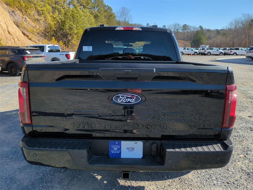 2026 Agate Black Metallic 2026 Ford F-150 STX 4WD 2.7L V6 EcoBoost 4WD. Ford Connectivity Package (1-Year Included), GVWR: 6,650 lbs Payload Package, Internet access capable: 5G Modem - Ford Connectivity Package, 4WD, 3.55 Axle Ratio, 4-Wheel Disc Brakes, 6 Speakers, ABS brakes, Air Conditioning, Alloy wheels, AM/FM radio: SiriusXM with 360L, Auto High-beam Headlights, Brake assist, Bumpers: body-color, Compass, Delay-off headlights, Driver door bin, Dual front impact airbags, Dual front side impact airbags, Electronic Stability Control, Emergency communication system: SYNC 4 911 Assist, Front anti-roll bar, Front Bucket Seats, Front Center Armrest, Front reading lights, Front wheel independent suspension, Fully automatic headlights, Heated door mirrors, Illuminated entry, Low tire pressure warning, Occupant sensing airbag, Outside temperature display, Overhead airbag, Overhead console, Panic alarm, Passenger door bin, Passenger vanity mirror, Power door mirrors, Power steering, Power windows, Radio data system, Radio: AM/FM Stereo with SiriusXM 360L, Rear Parking Sensors, Rear step bumper, Rear window defroster, Remote keyless entry, Security system, Speed control, Split folding rear seat, Steering wheel mounted audio controls, SYNC 4 with Enhanced Voice Recognition, Tachometer, Telescoping steering wheel, Tilt steering wheel, Traction control, Trip computer, Unique Sport Cloth 40/Console/40 Front-Seats, Variably intermittent wipers, and Wheels: 18" Gloss Black Courtesy Ford and Lincoln of Rome 101 Hwy 411 E Rome, Ga 30161 ROMEFORDLINC.COM 706.235.4453.