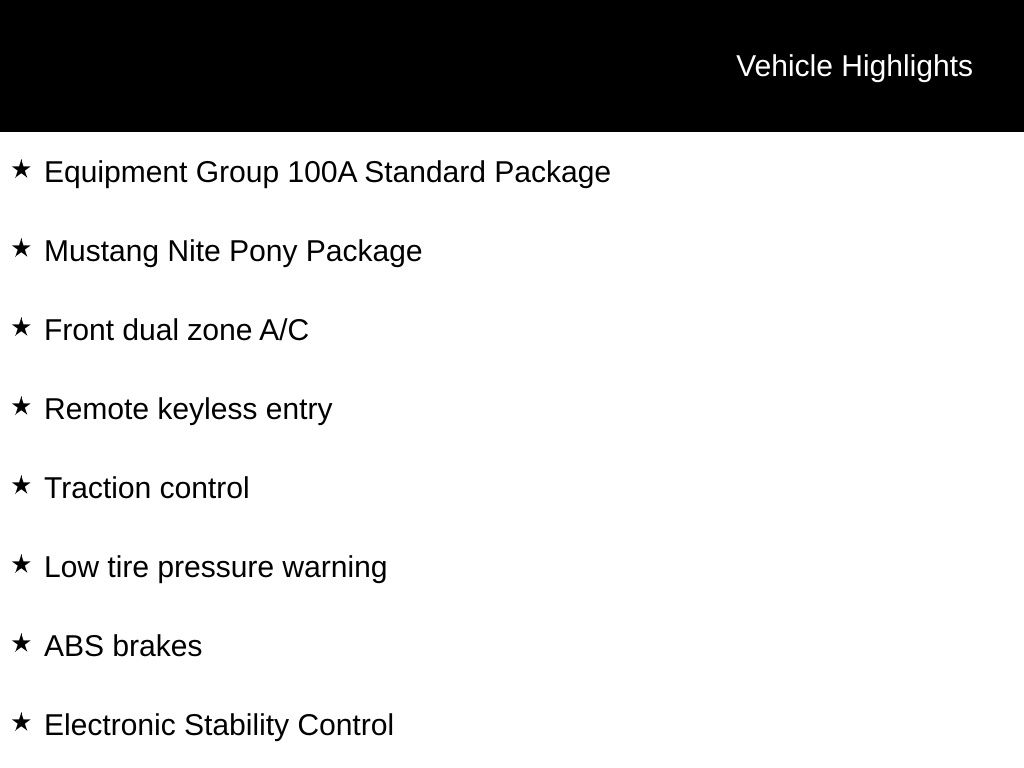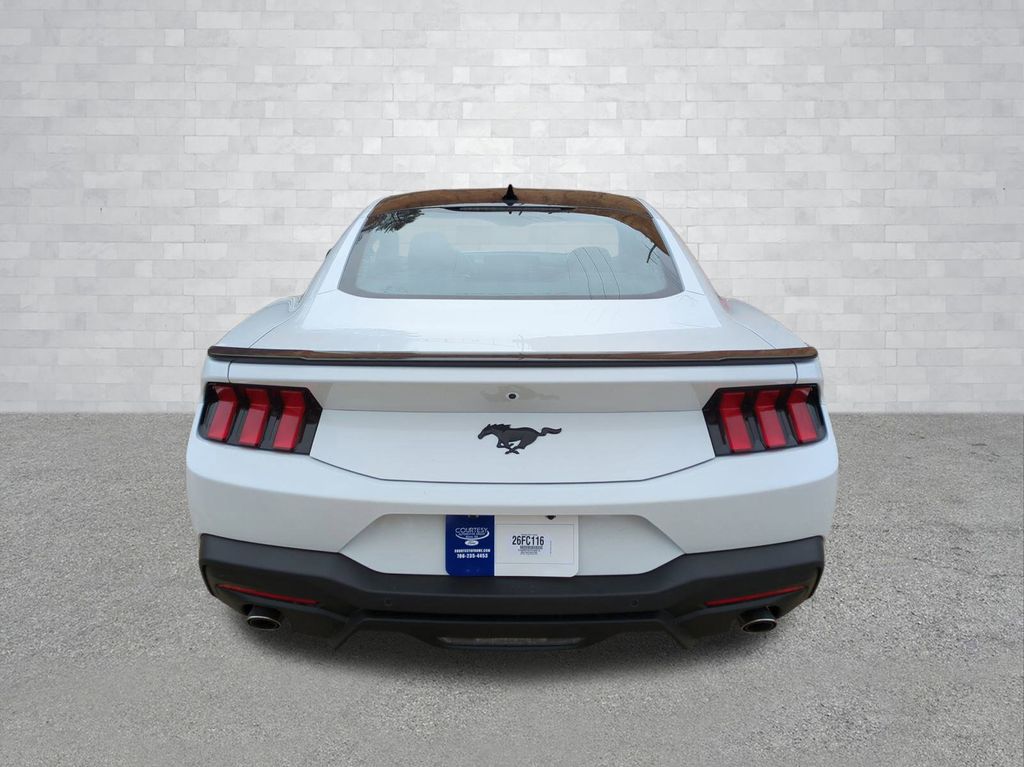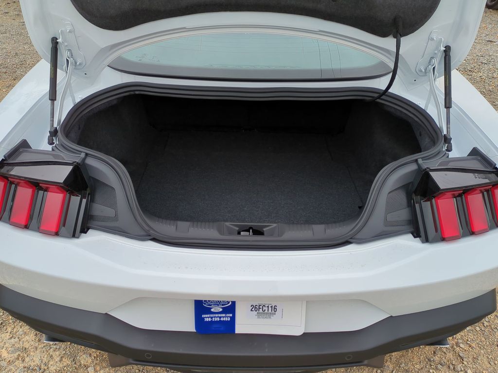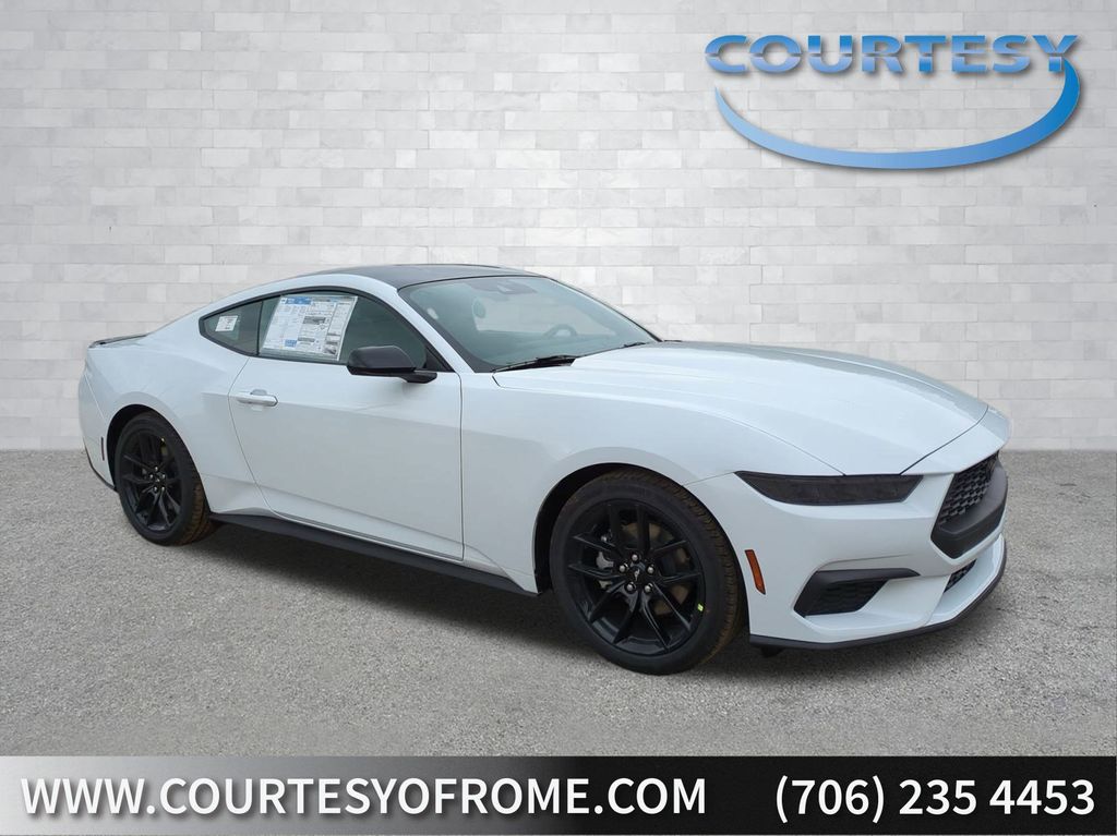 2026 Oxford White 2026 Ford Mustang EcoBoost RWD EcoBoost 2.3L I4 GTDi DOHC Turbocharged VCT 12.4" LCD Digital Driver Cluster, 13.2" LCD Centerstack Touchscreen, 4G WiFi Hotspot Telematics, Auto LED Headlights, Backup Camera, Power Mirror Package, Power Package, Push Button Start, 2D Coupe, EcoBoost 2.3L I4 GTDi DOHC Turbocharged VCT, 10-Speed Automatic, RWD, ABS brakes, Alloy wheels, Black Mirror Caps, Black Painted Wedge Decklid Spoiler, Compass, Electronic Stability Control, Equipment Group 100A Standard Package, Front dual zone A/C, Illuminated entry, Low tire pressure warning, Mustang Nite Pony Package, Painted Black Roof, Rain sensing wipers, Remote keyless entry, Speed-Sensitive Wipers, Traction control, Wheels: 19" x 8.5" Ebony Black-Painted Aluminum. Equipment Group 100A Standard Package (AM/FM Stereo, Cloth Bucket Seats, and SYNC 4), Mustang Nite Pony Package (Black Mirror Caps, Black Painted Wedge Decklid Spoiler, Painted Black Roof, and Wheels: 19" x 8.5" Ebony Black-Painted Aluminum), 2D Coupe, EcoBoost 2.3L I4 GTDi DOHC Turbocharged VCT, 10-Speed Automatic, RWD, ABS brakes, Alloy wheels, Compass, Electronic Stability Control, Front dual zone A/C, Illuminated entry, Low tire pressure warning, Rain sensing wipers, Remote keyless entry, Speed-Sensitive Wipers, Traction control, 4-Wheel Disc Brakes, 6 Speakers, Air Conditioning, AM/FM radio, Auto High-beam Headlights, Automatic temperature control, Brake assist, Bumpers: body-color, Delay-off headlights, Driver door bin, Driver vanity mirror, Dual front impact airbags, Dual front side impact airbags, Emergency communication system: 911 Assist, Exterior Parking Camera Rear, Four wheel independent suspension, Front anti-roll bar, Front Bucket Seats, Front Center Armrest, Front reading lights, Fully automatic headlights, Knee airbag, Leather Shift Knob, Occupant sensing airbag, Outside temperature display, Overhead airbag, Overhead console, Panic alarm, Passenger door bin, Passenger vanity mirror, Power door mirrors, Power steering, Power windows, Radio data system, Rear anti-roll bar, Rear Parking Sensors, Rear window defroster, Speed control, Speed-sensing steering, Split folding rear seat, Sport steering wheel, Steering wheel mounted audio controls, Tachometer, Telescoping steering wheel, Tilt steering wheel, Trip computer, Variably intermittent wipers, and Voltmeter Courtesy Ford and Lincoln of Rome 101 Hwy 411 E Rome, Ga 30161 ROMEFORDLINC.COM 706.235.4453.
