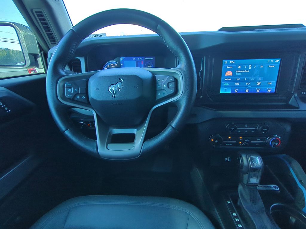 Indulge in the latest technology with features like SYNC 4, SiriusXM Radio with 360L, and a 7-speaker sound system. Stay connected and entertained on the go. The Bronco's rugged yet refined exterior, with its Black paint and Black Gloss-Painted Steel wheels, exudes a bold and confident presence.