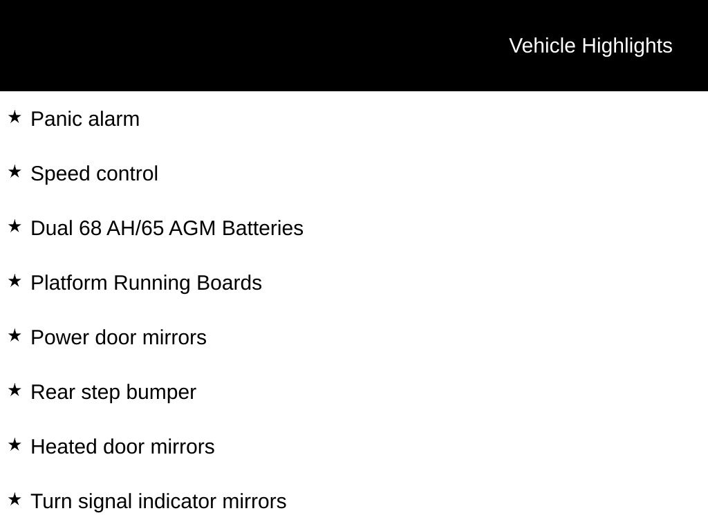 Comfort and convenience are also top priorities, with amenities like power driver's seat, power windows, remote keyless entry, and steering wheel-mounted audio controls. The dual 68 AH/65 AGM batteries and platform running boards add both functionality and style to this exceptional truck.